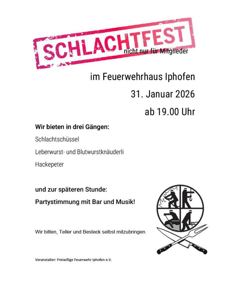 Traditionelles Schlachtschüsselessen mit Musik & anschließendem Barbetrieb im Feuerwehrgerätehaus. Gäste sind herzlich willkommen!