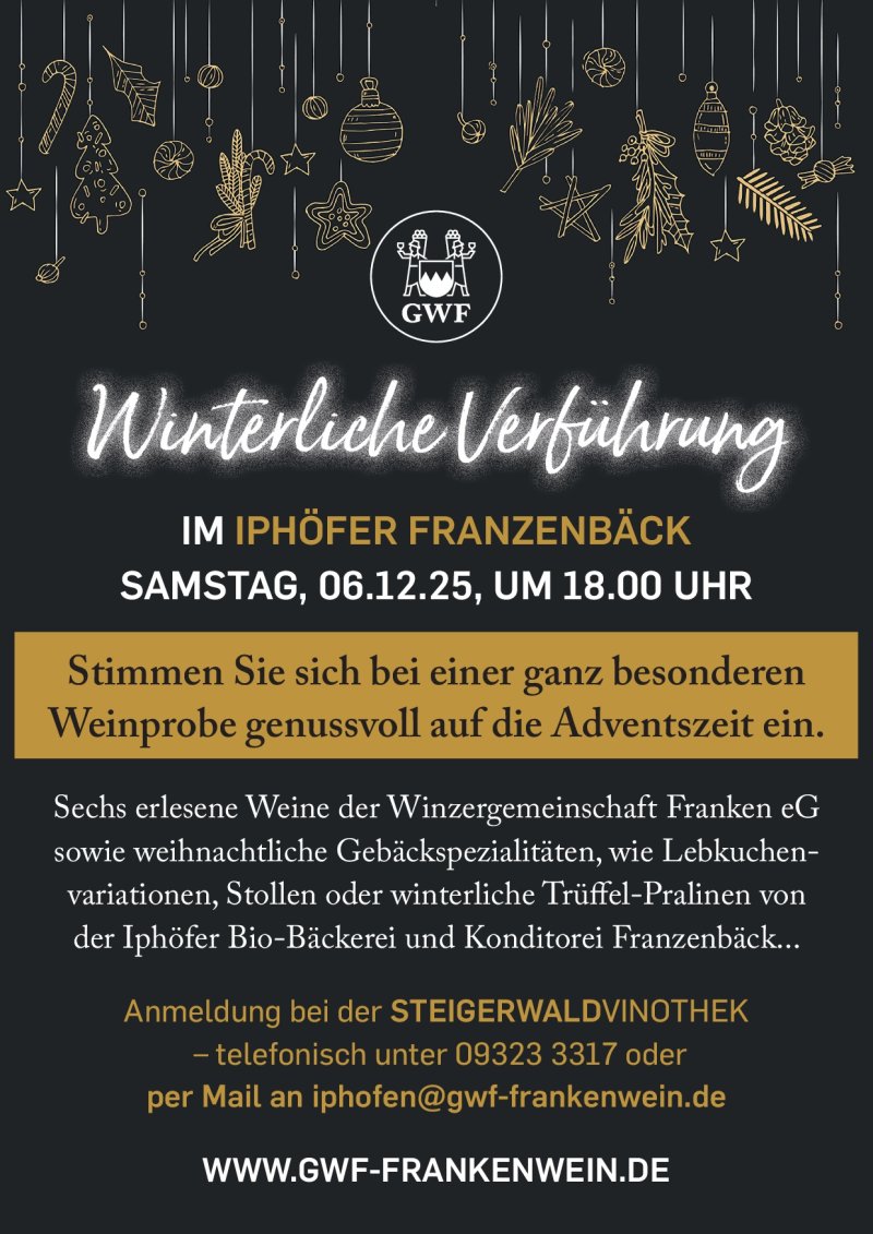 Stimmen Sie sich bei einer besonderen Weinprobe mit der SteigerwaldVinothek und dem Iphöfer Franzenbäck genussvoll auf die Adventszeit ein.