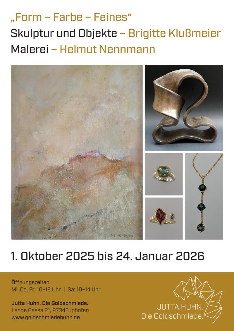 Ausstellung "Form - Farbe - Feines" mit Objekten und Skulpturen von Brigitte Klußmeier, Malerei von Helmut Nennmann und handgefertigten Schmuckstücken von Jutta Huhn.