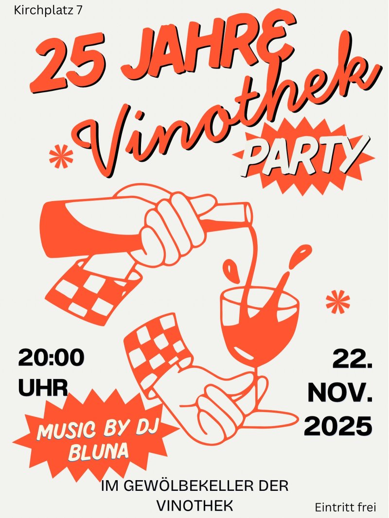 Anlässlich des Jubiläums "25 Jahre Vinothek Iphofen" gibt es eine große Party mit Musik von DJ Bluna im Gewölbekeller der Vinothek. Feiern Sie mit uns und genießen Sie einen tollen Abend bei gutem Wein und bester Gesellschaft!